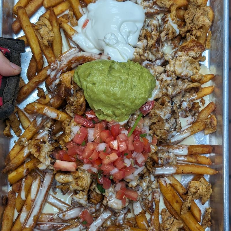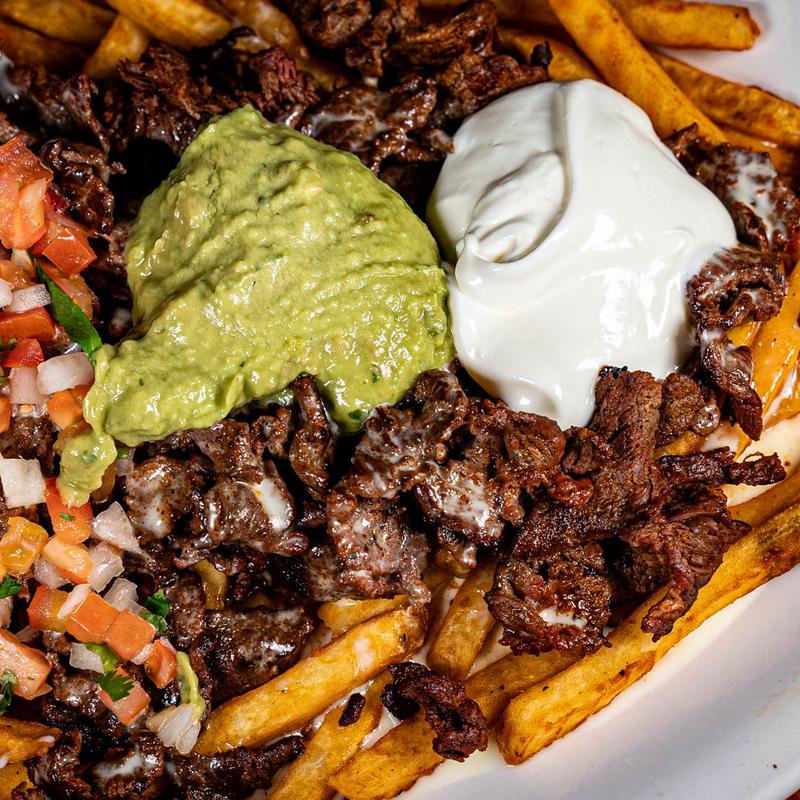 A bed of french fries with your choice of meat topped with sour cream, pico de gallo, guacamole and queso.