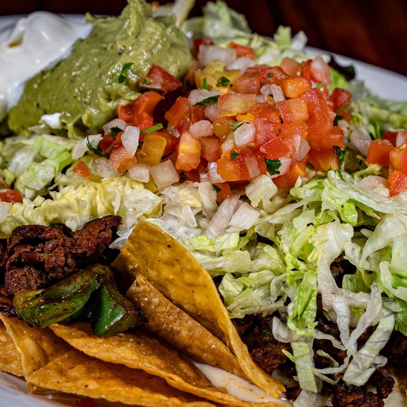 A bed of chips topped with queso, grilled peppers, grilled onions and your choice of meat | Add Supreme +$2.50 (lettuce, pico de gallo, sour cream, guacamole).