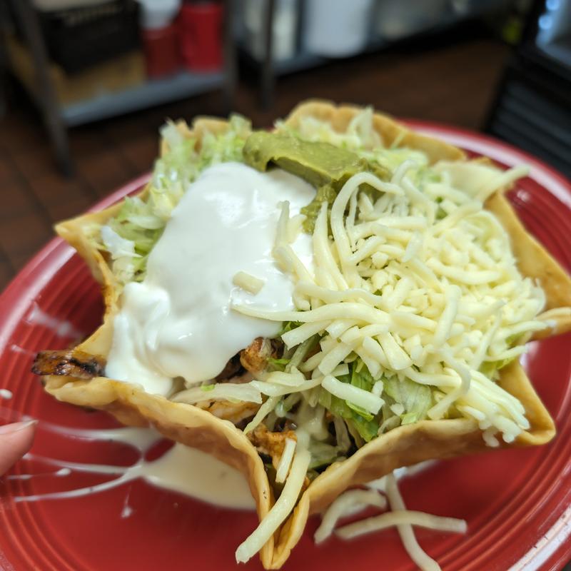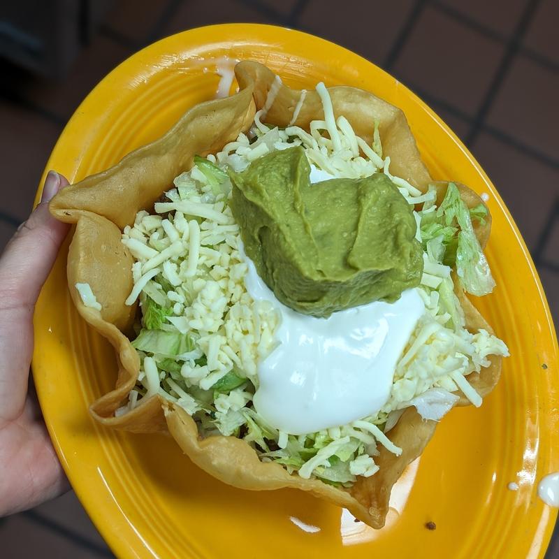 A crispy taco shell filled with your choice of meat, queso, lettuce, shredded cheese, sour cream, and guacamole.